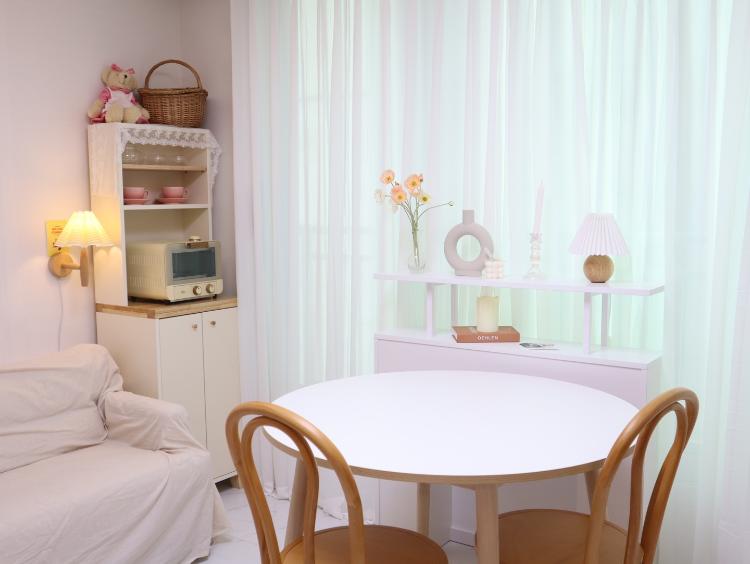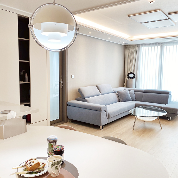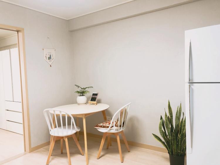 주방 역시 화이트톤으로 깔끔하게 인테리어 했어요. 주방은 요리를 하는 공간인 만큼 깔끔해 보이는 인테리어가 최고죠. 또 아치형 중문을 시공해서 집안의 첫인상을 부드러워 보이게 했는데요. 중문을 설치하면 공간을 분리해 주기 때문에 시각적인 효과까지 더 해 준답니다:)