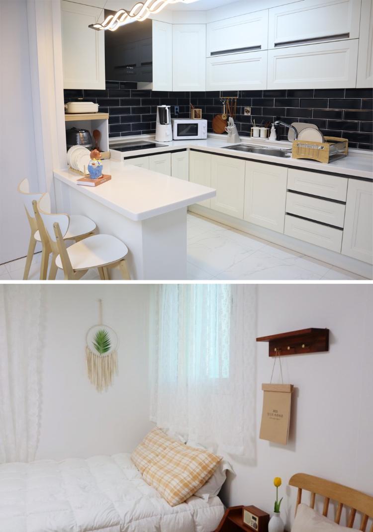 주방은 ㄷ자 레이아웃인데요. 화이트와 블랙 컬러로 모던하면서도 심플한 주방입니다:) 안방 역시 화이트와 우드톤이네요~심플한 화이트&우드톤과 함께 카페 같은 분위기의 소품 등을 놓아보세요. 그러면 감성 있는 나만의 아늑한 공간이 탄생할 거예요:)