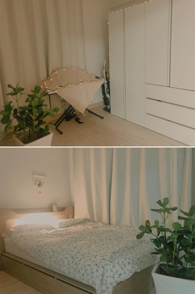 옷장 옆에 남는 공간은 수납공간으로 사용하기 딱인데요. 청소기, 폼롤러 같은 자주 사용하지만 미관을 해치는 물건을 두면 수납공간과 시각적 효과 두 마리 토끼를 잡을 수 있어요. 만약 신혼집 인테리어를 고민 중이시라면 롯데하이마트 고객님들의 인테리어를 참고해보세요:)