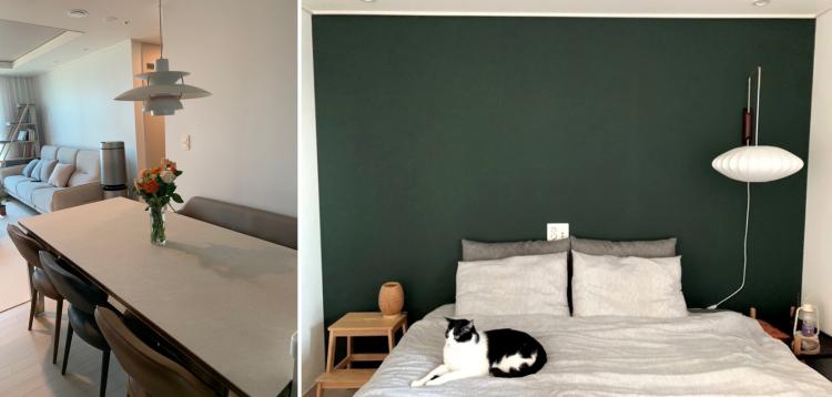침실은 전체적으로 화이트 컬러에 한쪽 벽을 딥 그린 컬러로 선택해서 심플하면서도 전체적인 방 분위기의 중심을 잡아주었습니다. 또 그린 컬러는 심리적으로 안정감을 주기 때문에 침실에 포인트 벽지로 사용한다면 휴식을 취할 수 있는 편안한 인테리어가 완성됩니다:)