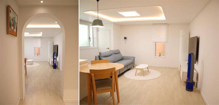 모난 부분 하나 없이 부드러운 곡선으로 인테리어 된 이 집은 롯데하이마트 “별명안정할래요” 고객님의 신혼집입니다~벽 면과 문틀을 전부 라운드 형태로 시공해서 넓어 보이는 인테리어를 완성했습니다:) 화이트로 깔끔하지만 라운드 인테리어로 아늑한 인테리어를 완성됐어요~