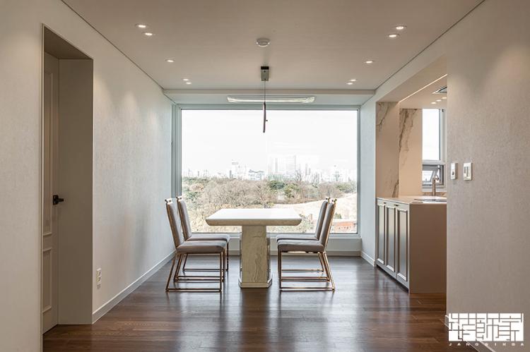 다이닝룸은 큰 창을 통해 탁 트인 전경이 멋스러운 공간이었습니다. 그래서 거실과 같이 최대한 깔끔하고 간결하게 디자인하기 위하여 기존의 클래식한 몰딩을 철거하여 마이너스 몰딩을 시공하였고, 주 컬러 역시 화이트 컬러로 진행하였습니다