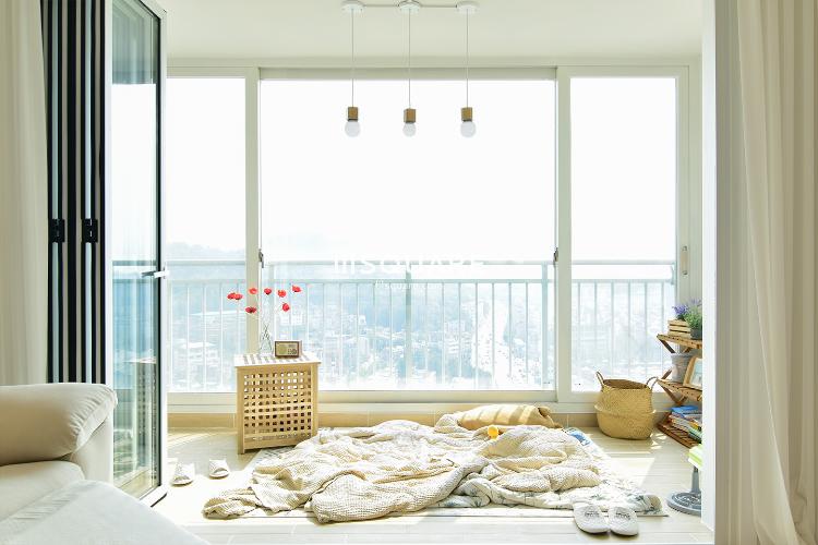 내추럴한 소품들과 패브릭으로 꾸며진 발코니. 고객님의 취향을 엿볼 수 있는 공간으로 날씨 좋은 주말엔 폴딩 도어를 오픈하면 따뜻한 힐링공간이 만들어집니다ㅎ