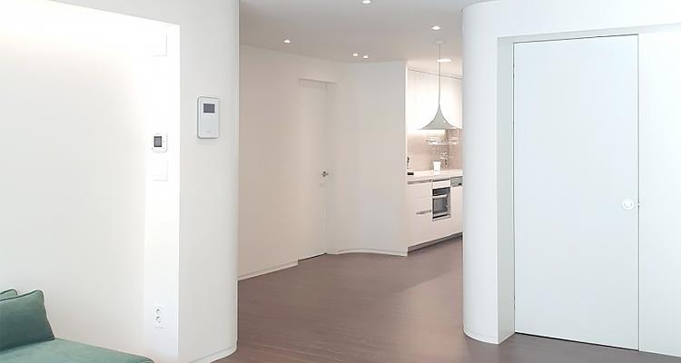 전체적으로 천장과 벽은 웜 화이트로 가볍게, 그리고 바닥은 다크 브라운 컬러의 마루로 무겁게, 시각적으로 천고를 길게 느끼도록 시공했어요. 쓸데없는 몰딩이나 장식은 모두 철거하고 마이너스 몰딩으로 시공해서, 더 깔끔하고 세련된 느낌을 주었고요.