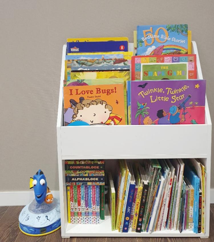 방에는 2층 침대를 두어 요새 같은 느낌을 주었어요. 밤에 읽을 책들은 주로 얇은 단편을 두었고, 자기 전에 한두 권씩 읽어주고 있어요.