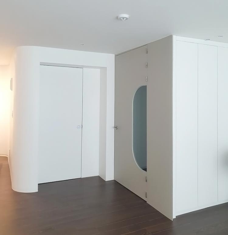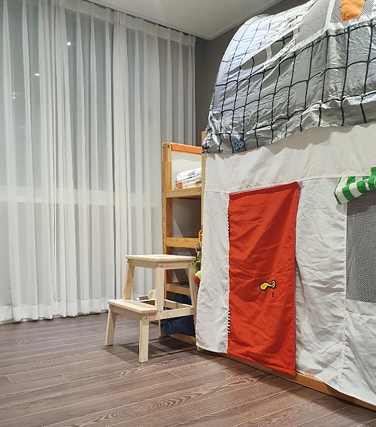 디자인 덕분에, 마치 양개형 도어 같은 개방된 느낌을 주고 있어요.현관 바로 앞은 벽체를 둥글게 처리해서 아이가 포근함을 느낄 수 있도록 설계했어요. 놀이하는 방과 잠자는 방을 분리해주고 싶었고, 바로 이 방이 아이가 자는 방이에요.