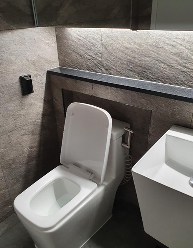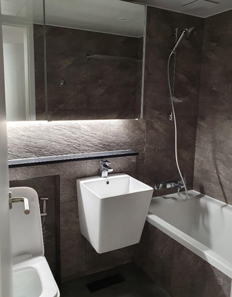 울퉁불퉁 재질이 잘 보이는 타일을 원해서 직접 고른 타일인데, 조명을 켰을 때 그 매력이 더해져서 참 예쁜 욕실이에요. 아이가 있는 집이다 보니 목욕장난감부터 물감까지 다양한 용품을 수납해야 해서, 슬라이드 거울장을 설치했어요. 샤워 수전은 안개분사가 될 수 있는 제품으로 별도로 시공해주셨는데, 간이 스파 효과가 나요. 변기와 세면대는 일반적인 집보다는 조금 낮게 설치해서 아이가 사용하기 편하게 했어요.
