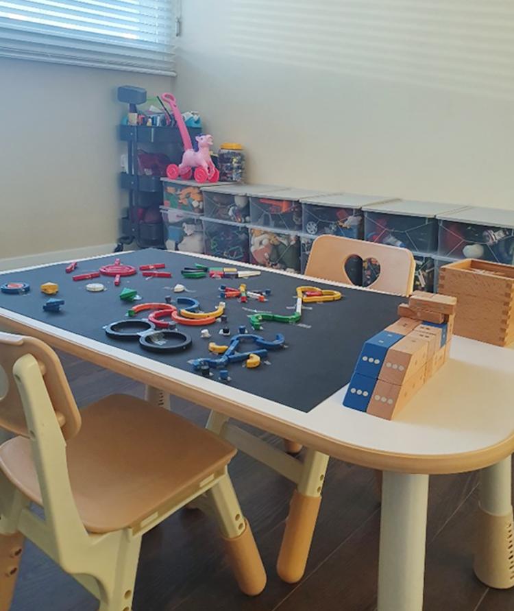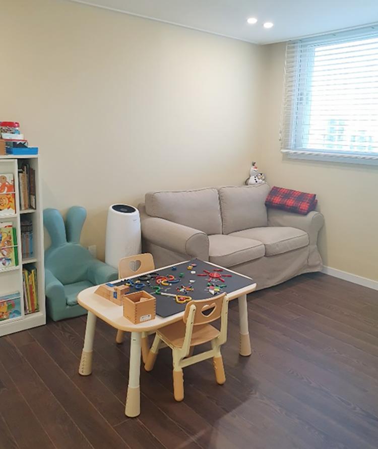 아이가 4살이다 보니 특히 로봇, 레고 등 크고 작은 장난감과 교구가 많아서 어떻게 정리할까 고민했는데, 장난감은 종류별로 정리해서 투명 박스에 넣어두었고 놀이를 한 이후에 바로 정리정돈하고 있어요. 아이가 쉽게 꺼내고 정리할 수 있어 좋아요. 그 외에는 책을 자주 읽어주는데, 의자에 앉아서 오래 읽어주려니 불편해서 작은 2인용 소파를 들여서 소파에서 읽어주곤 해요.