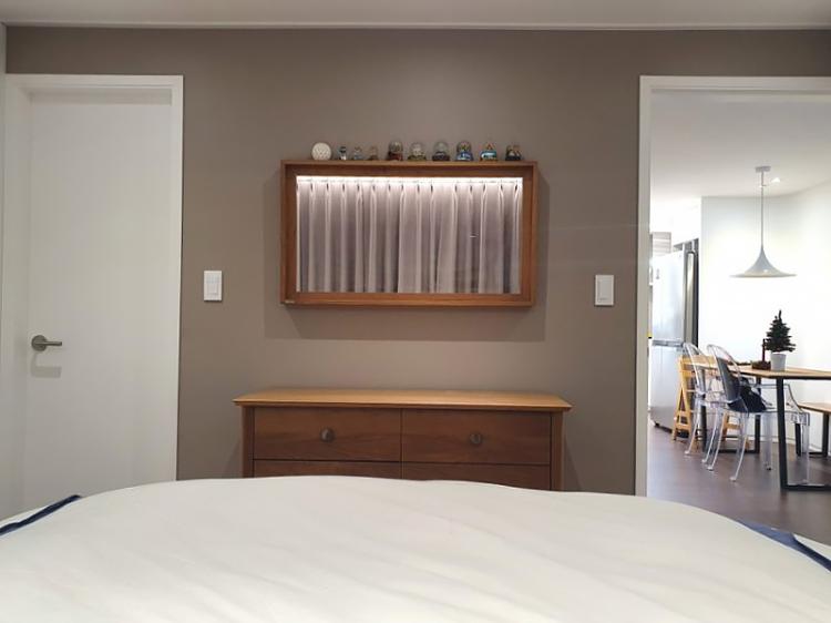 살아보니 침실은 어두워야 하더라고요. 강한 아침 햇살 때문에 깨어버리면 곤란하니까요. 그래서 벽지도 브라운 컬러로 한 톤 낮추었고, 암막 커튼도 브라운 톤으로 설치했어요. 방 한 면은 모두 붙박이장을 설치해서 사계절 의류를 보관할 수 있도록 했어요.