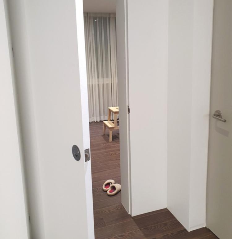 거실은 소파와 TV 이외에는 그 어떤 것도 눈에 안보이도록 했어요. 베란다도 모두 확장하고, 앞베란다로 가는 문은 히든도어로 설치해서 마치 벽처럼 일체감을 주었어요. 덕분에 집이 훨씬 넓어보이고, 지저분한 짐들은 창고에 정리할 수 있었어요. 중문과 연결해서 수납장을 길게 짰는데, 자주 쓰지만 정리가 필요한 손톱깎이부터 마사지 기계, 구급약통 등등 잡동사니를 모두 넣어두었어요.