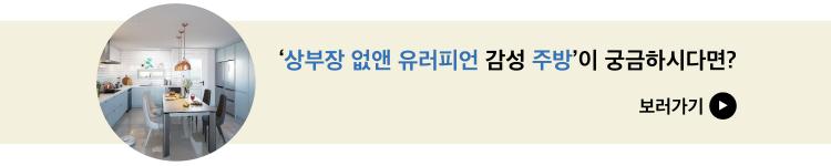 요즘에는 싱크대 상부장을 없앤 인테리어가 인기몰이 중이라고 해요. 상부장을 없앤 주방이 집 전체의 시원하고 개방감이 극대화되는 것을 느낄 수 있어요. 실제보다 넓어 보이는 것은 물론이고요. 파스텔톤의 밝은 주방 컬러가 산뜻하고 화사한 기분 좋은 에너지를 뿜어주는듯합니다.