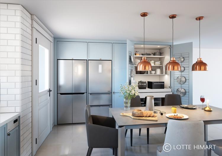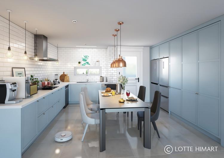 누구나 한 번쯤 꿈꿔보는 우아한 프렌치 스타일의 주방을 소개합니다. 주방의 블루 컬러가 단연 눈이 돋보여요. 주방 공간 속 고급스러움을 담아내고 싶다면 현대적인 디자인에 블루 컬러의 웨인스코팅과 골드 포인트로 우아함을 더 해보는 건 어떨까요? 마치 샹들리에 같은 화려한 조명이 은은하게 클래식한 멋을 더해주고 있어요.