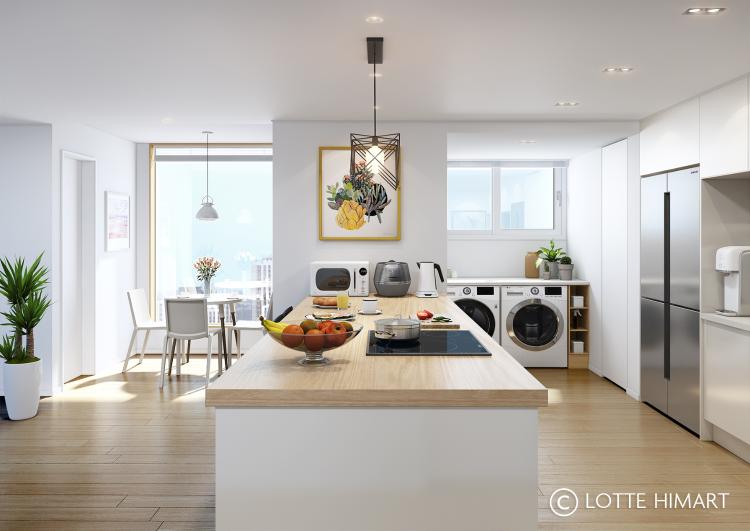 대면형 주방의 장점은 넓은 작업 공간과 동선이에요. 넓은 식탁을 조리대로 사용해 가족과 함께 요리하며 즐거운 시간을 보낼 수 있겠죠? 이런 식의 아일랜드 구조와 더불어 세탁기, 건조기, 냉장고 등 가전으로 완벽하게 동선을 정리하면 더 편안하고 넓은 주방을 완성할 수 있답니다!