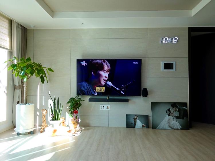 거실 아트월 쪽을 보면 65인치 TV가 눈에 띄어요.
