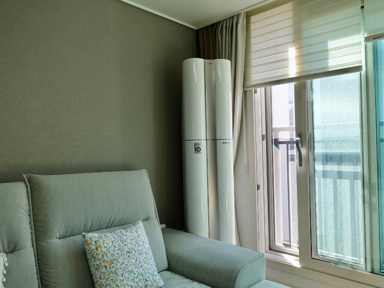 베란다 옆에는 대각선 방향으로 에어컨을 설치해 거실부터 안방, 주방까지 바람이 잘 통하도록 공간을 활용했어요.