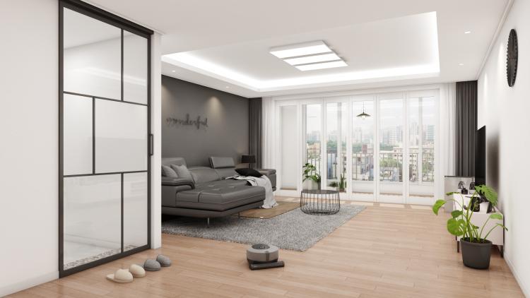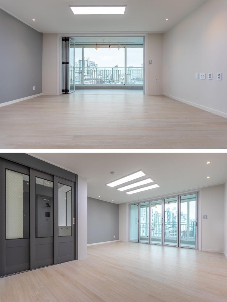 저희 집의 콘셉트는 그레이 & 화이트. 도화지와 같은 바탕화면에 그레이 컬러로 포인트를 주었어요. 검은색은 아무래도 먼지가 잘 보여서 짙은 그레이 색을 선택했어요. 대신 답답하지 않은 공간 연출을 위해 중문은 슬라이딩 도어를 베란다는 폴딩도어로 시공했답니다.
