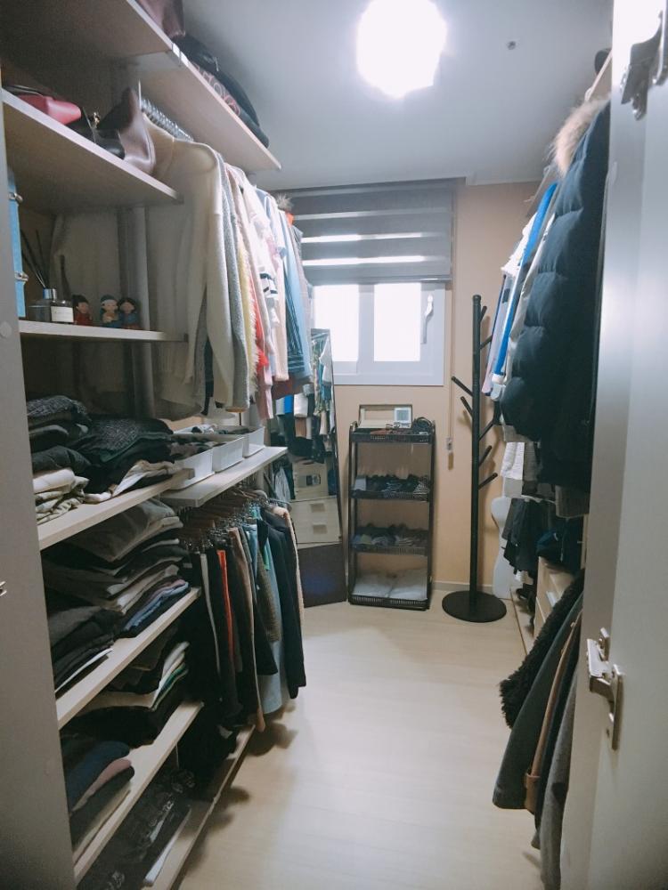 드레스룸을 소개할게요. 깔끔하게 정리된 드레스룸인데 청소할 때가 된 거 같아요.