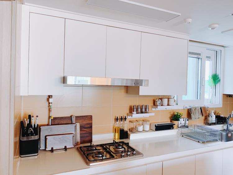 반대편엔 가스레인지가 있고, 자주 사용하는 양념은 소분해서 사용하고 있어요~