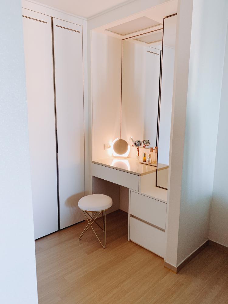 안방 바로 맞은편에 있는 화장대입니다. 깔끔한 화이트로 꾸며보았어요. 작지만 수납력이 좋아 만족하고 있어요~