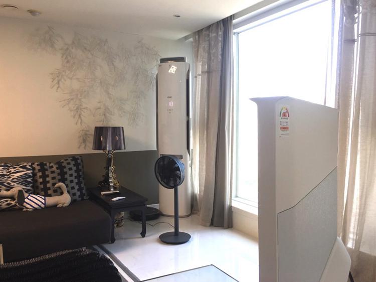 거실의 가전은 화이트 위주로 골랐고 거실의 가구는 다크한 컬러로 배치하여 가전과 가구를 나름 대비되게 표현해 보았어요.
