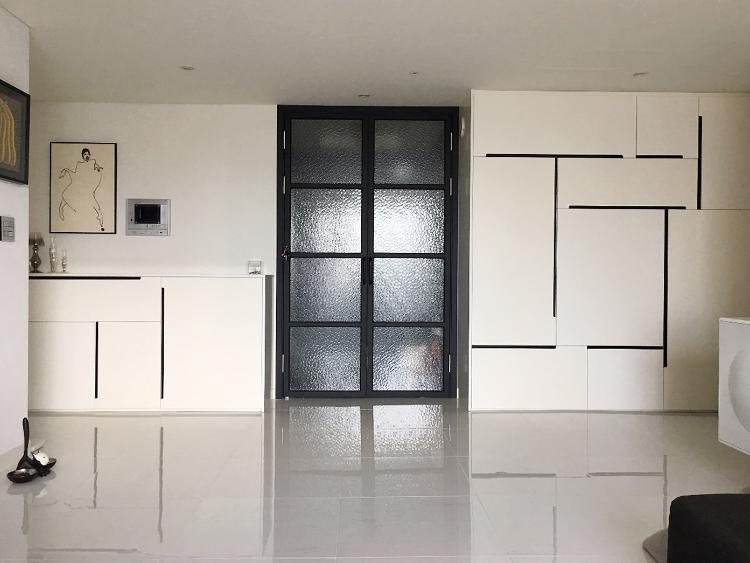 발코니가 없는 저희 집에는 물건을 보관할 창고가 따로 없다 보니 거실의 한쪽 벽면을 붙박이장을 짜서 계절가전 및 각종 도구들을 보관 중이랍니다.