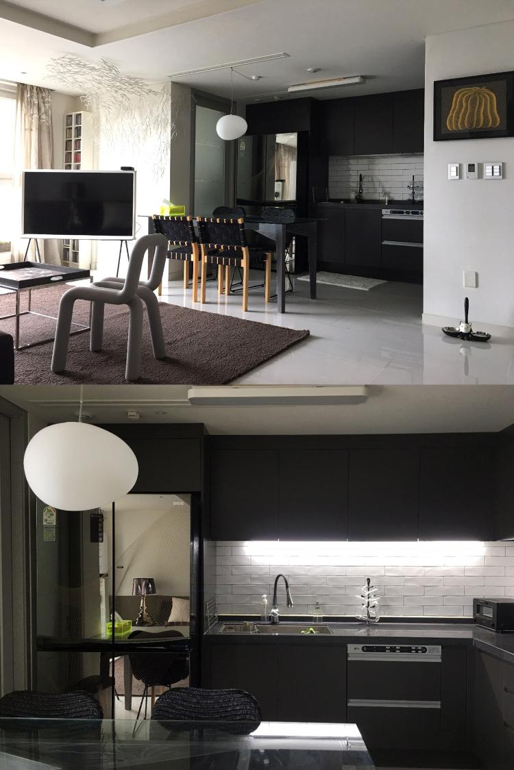 기존의 백색가전이 일반적이나 주방의 분위기를 다른 집들보다 색다르고 더 어둡고 시크한 분위기를 연출하고 싶었어요.