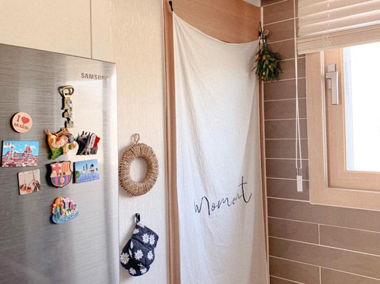 다용도실 문이 있는 게 보기 싫어서 커튼 하나 달아줬더니 분위기 확 사는 부엌! 뒹굴고 나 두르는 냄비받침이랑 장갑도 저렇게 걸어주니 귀여워요.