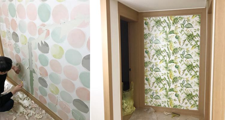 전세이지만 절대 그냥 둘 수 없었던 물방울무늬의 포인트 벽지도 요렇게 우리 돈 들여 열심히 수입벽지로 탈바꿈한 보람이 있어요.