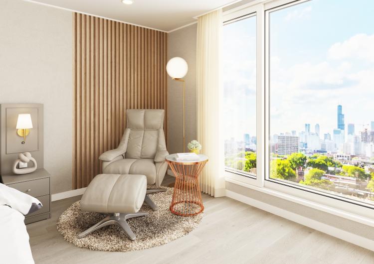 침대 옆 쪽 휴식 공간은 템바 보드로 분위기를 바꿔주고 창문뷰를 너머 도심 뷰를 바라보며 쉴 수 있는 무드를 만들어줬어요. 리클라이너와 사이드테이블 그리고 스탠드와 러그까지 포인트들을 모두 담아 만들었답니다. 특히 러그같은 경우 침대 밑에 깔아 호텔 느낌을 낭낭하게 주는 경우도 있지만, 이번엔 한 쪽에 휴식공간을 마련하게되어 리클라이너 아래에 적용해보았답니다!