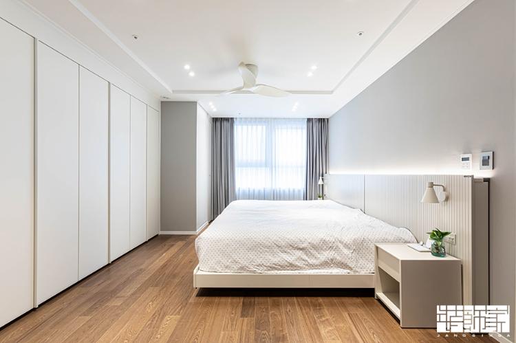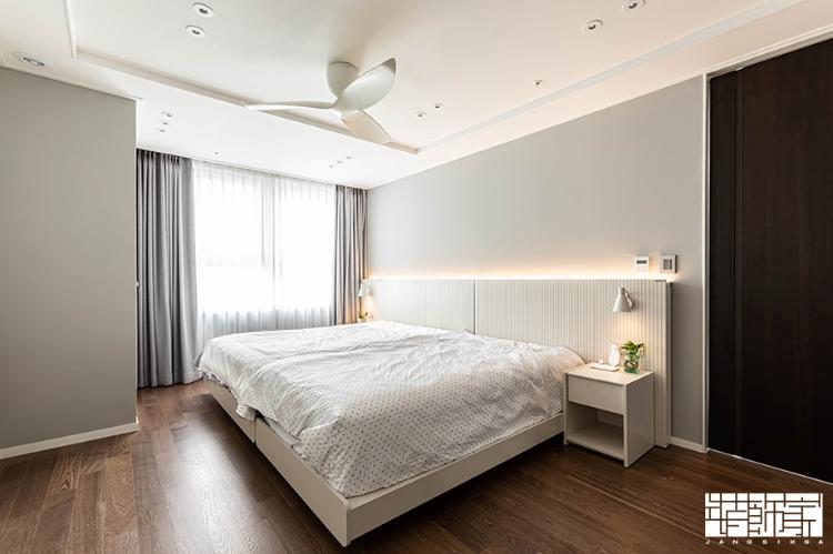 내추럴한 우드 마루로 따뜻한 느낌을 자아낸 침실은 아트월 인테리어 효과가 느껴지는 뉴트럴 화이트 침대를 설치해 호텔 분위기를 연출하였습니다.