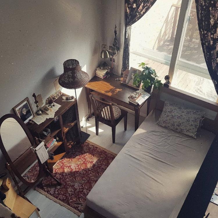 제 집은 분리형 원룸입니다. 이곳은 침실인데요. 사진에서 보시다시피 빈티지, 월넛 컬러의 가구, 플로랄 패턴의 패브릭을 좋아해요.