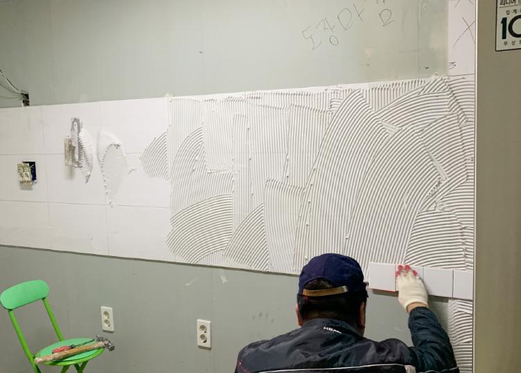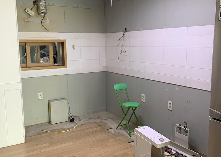 곧 철거할 때의 주방이라 그릇들 다 뺀 상태의 주방이에요. 철거하고, 타일 붙이고, 석고보드 마감하고, 셀프페인팅 중이에요.