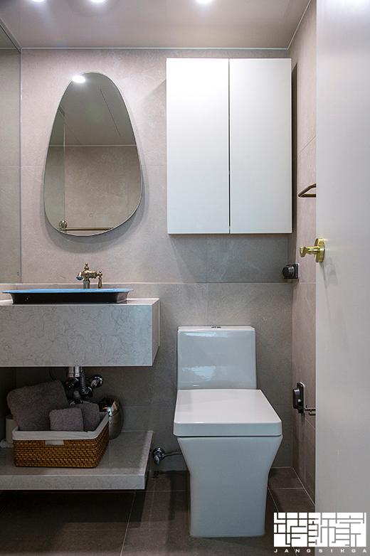 안방 욕실은 부드러운 느낌의 그레이 타일로 마감하여 아늑한 분위기를 조성했어요. 여기에 클래식한 수전과 거울로 앤티크 한 감성을 더했습니다.