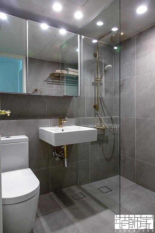 거실 욕실은 안방 욕실과 달리 벽면과 바닥을 모두 그레이 타일로 통일해 모던하고 차분한 분위기를 연출했어요. 그리고 고급스러운 골드 액세서리로 포인트를 주었습니다.