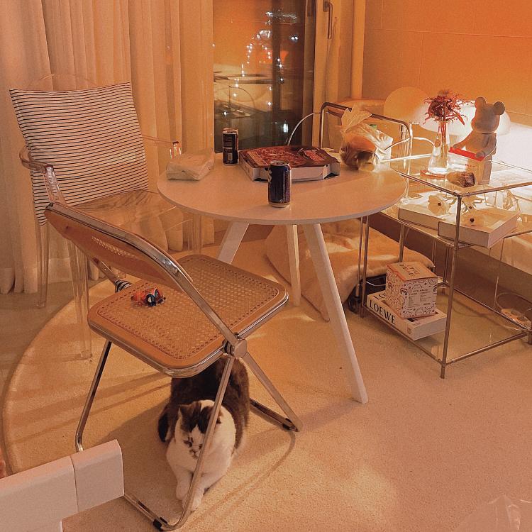 모듈가구와 빈티지 트롤리 그리고 홈카페 테이블이 있는 공간, 주로 야식 먹방 스팟입니다.