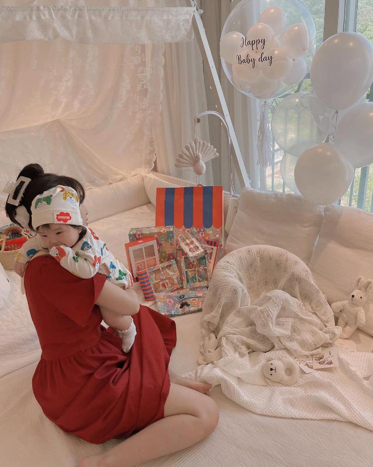 옆엔 아가 침대가 있을 적이에요. 신생아 시절 아가 기념 촬영 해주느라 애착인형도 놓고 침구는 항상 화이트 톤을 유지하고 있어요.