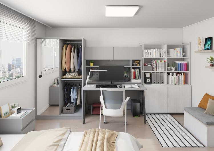 코로나 19로 원격 수업이 일상화 되면서 집에서도 집중이 될 수 있는 환경을 마련해주는 게 굉장히 중요해졌죠. 방안에서 생활하는 시간이 길어졌기 때문에, 규칙적인 생활습관을 가질 수 있도록 ‘집중하는 분위기’로 꾸며주는 게 좋습니다. 먼저 책상은 침대와 등지게 배치하는 게 중요한데요, 시각적으로도 침대가 보이지 않아야 집중력을 높일 수 있는 환경이 마련되기 때문이죠.