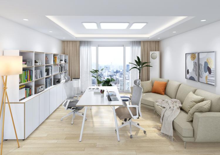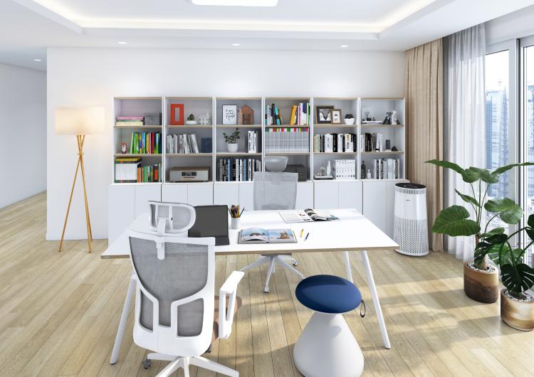부부, 가족끼리 재택근무가 많아져 큰 서재 공간이 필요하다면, 과감하게 거실 공간에 홈오피스를 꾸미는 것도 방법입니다. 이럴 때는 공동으로 쓰는 공간인만큼 더 쾌적하게 연출하는 것이 중요한데요. 심플한 화이트 컬러의 테이블과 책장을 선택해 공간감을 확보했고, 베이지톤의 소파를 두어 일 하는 중간에도 책을 보거나 휴식을 취할 수 있도록 꾸몄어요.