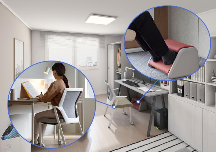 장시간 책상 앞에 앉아 있는 학생들을 위해서는 집중을 도와주는 의자 선택이 정말 중요하죠. 올바른 자세를 유지하며 집중할 수 있게 해주는 의자를 찾는다면, 시디즈의 ible(아이블) 메쉬의자를 추천드릴게요. 앞쪽 다리는 바퀴로 뒤쪽 다리는 고정 형태로 개발되어 쉽게 밀리지 않아 움직임을 최소화하면서 완벽한 집중을 도와주는 제품입니다. 허리를 잡아주는 탄탄함으로 오래 앉아 있어도 편안해 일명 ‘서울대 도서관 의자’로 수험생들이 추천하는 의자라고 하네요. 여기에 체압을 분산시켜 장시간 바른 자세를 유지하는데 도움을 주는 2단 발받침대를 더해주면, 집중력을 높여주는 완벽한 공부방 인테리어 완성!