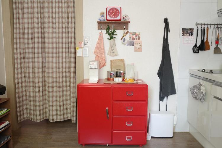주방 겸 거실은 2년 동안 가장 많은 변화가 있었던 곳이에요. 처음에는 레트로풍의 빨간 장식장을 창가에 놓고, 창가 쪽에 1인 소파를 배치해서 창밖을 보면서 편하게 쉴 수 있는 공간으로 구성을 했는데요