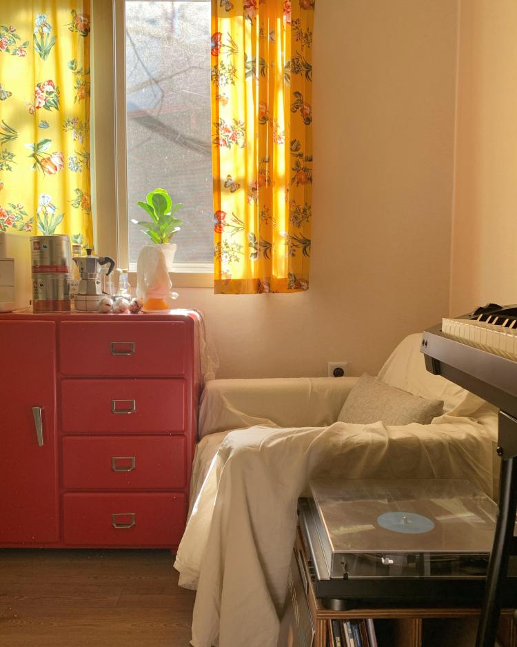 저는 패턴이 들어가 있는 커튼으로 포인트를 주는 걸 좋아해서 아주 신중하게 커튼을 고르는 편이에요. 여름에는 얇은 소재감의 쉬폰 커튼을, 봄 가을에는 살짝 비치는 느낌의 얇은 면 커튼을, 겨울에는 아늑한 느낌을 줄 수 있는 자카드 등의 두꺼운 커튼을 선호합니다. 특히 겨울에 두꺼운 커튼을 걸면 방한 역할도 톡톡히 할 수 있으니 일석이조라고 할 수 있죠.