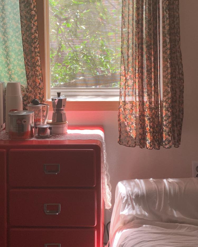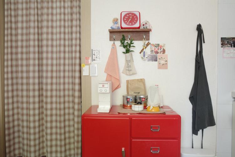 창가에 있던 빨간 수납장이 위치를 바꿔 홈 카페의 기능을 좀 더 충실하게 수행할 수 있게 되었어요.