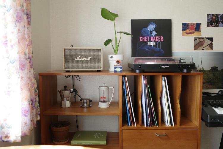 1인 소파를 없애고 원래 싱크대 쪽에 배치해서 식탁의 역할을 충실하게 수행했던 테이블을 창가 쪽으로 옮기니 식사도, 작업도 가능한 다용도 테이블로 역할이 바뀌게 되었고요. LP 수납을 할 수 있는 수납장을 새로 들여서 좀 더 작업 공간으로서의 분위기를 내보았어요.