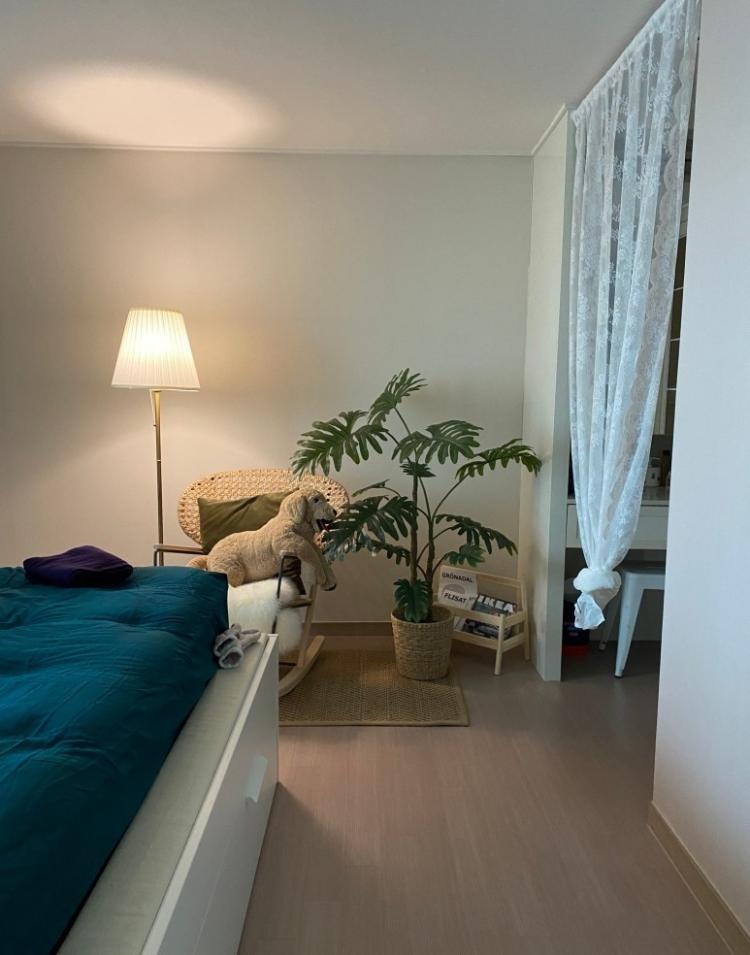 침실 사이에는 또 다른 패브릭, 망사 커튼이 답답하지 않은 공간 분리 효과를 주어, 은은함이 배가 되었어요. 망사 커튼은 공간의 비침을 통해 좁은 공간의 답답함도 덜어준답니다:)