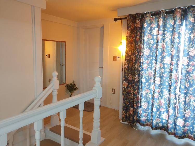 다음은 2층을 소개해드릴게요. 맨 처음 계단을 올라오면 바로 보이는 세탁실이에요. 앞에 라틴 의자를 두어 빨래를 기다리며 앉아있어요