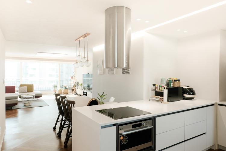 그래서 리모델링하면서 공간이 넓고 동선이 편한 오픈형 주방으로 리모델링 했답니다. 통로 부분은 식탁 위치에 유의하며 꾸며줬어요.