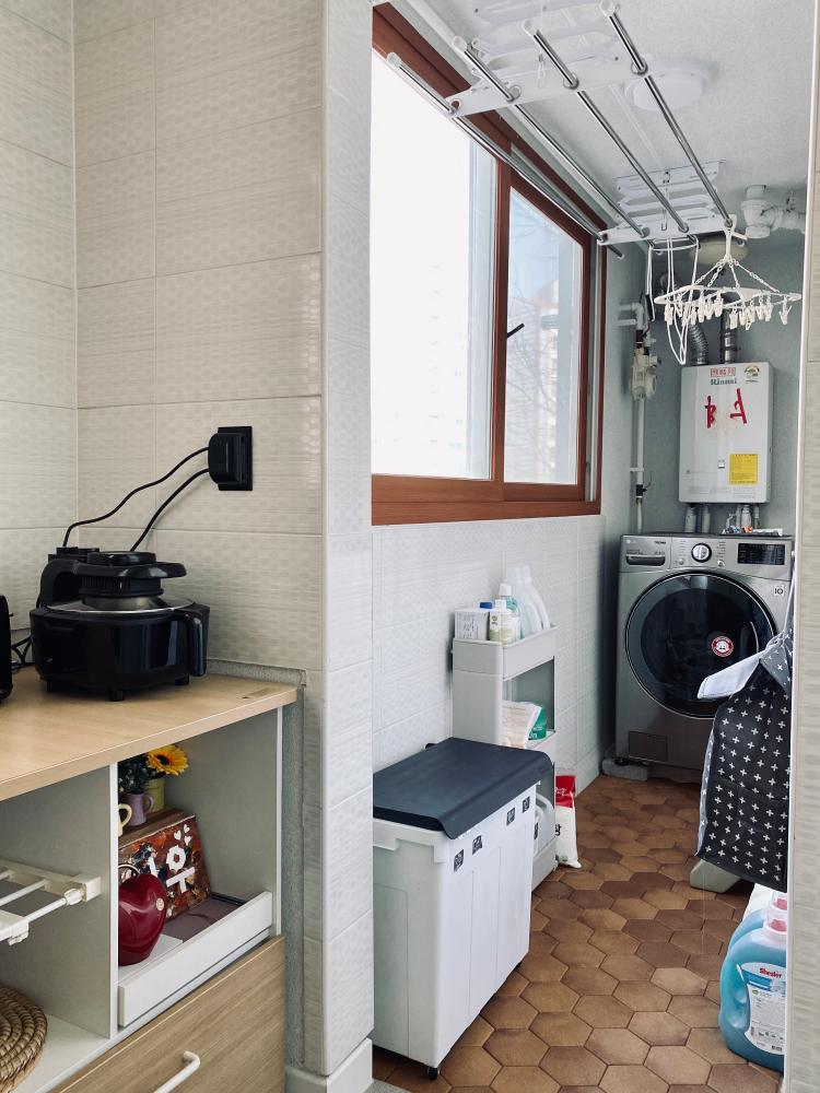 바로 옆 세탁실엔 세탁기와 분리수거함 이렇게 세탁실에 필요한 것만 놓고 사용 중이고요. 건조기는 놓을 자리가 없어서 앞 베란다 쪽에 놓아두었어요.