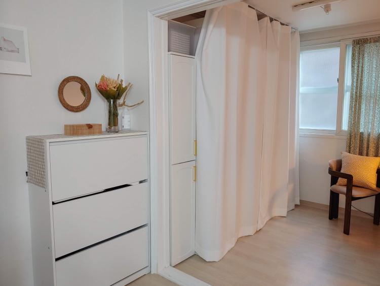 현관에서는 바로 작은방이 이어지는데요. 원래는 미닫이문이 있었는데 답답해 보여 떼어두니 훨씬 넓고 밝아 보이더라고요.