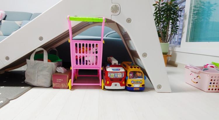 나름 깔끔해 보이는 이유는 미끄럼틀 계단 아래 빈 공간이 장난감 수납장 역할을 해주기 때문에 잡동사니들은 모두 미끄럼틀 아래 수납하고 있어요. 아무래도 가려져서 잘 보이지 않으니 깔끔해 보이고 안 가지고 놀 땐 저 자리가 진짜 최고예요.