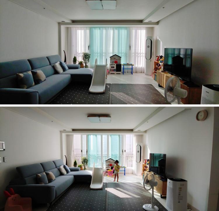 거실은 최대한 깔끔하게 사용하기 위해 노력하고 있는데 아무래도 아이가 어려서 쉽지 않네요 ㅎ 낮 동안 신나게 다온이가 어질러 노면 신랑이랑 저는 치우기 바쁘고요. 자칫 허전해 보일 수 있는 거실이지만 블루 패브릭 소파가 포인트 역할을 톡톡히 해주고 있는듯합니다.